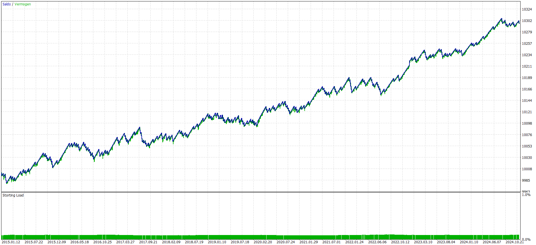 Figure 2 is generated based on a 0.01 lot size, taking into account a starting capital of 10,000 USD. Over the entire 10 years, the automated trading strategy is performing quite consistent. There are periods of consecutive winners, and periods of consolidation where no real gains are made.
